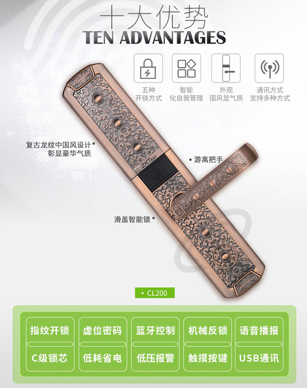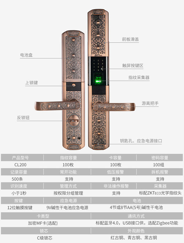 商品名稱:中控智慧(ZKTeco)CL200指紋鎖家用別墅防盜電子門鎖手機APP遠程遙控智能密碼鎖 (指紋+密碼+刷卡+鑰匙+手機APP)青古銅 標配