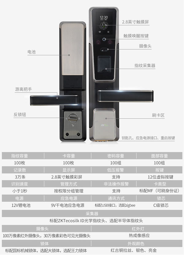 商品名稱:中控智慧(ZKTeco)ZM100指紋鎖電子鎖智能門鎖密碼鎖防盜門鎖家用 亮金色 標配
